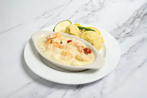 Sauteed jumbo shrimp in a White wine cream sauce tossed with tomatoes & capers, served with whipped potatoes & seasonal vegetables.